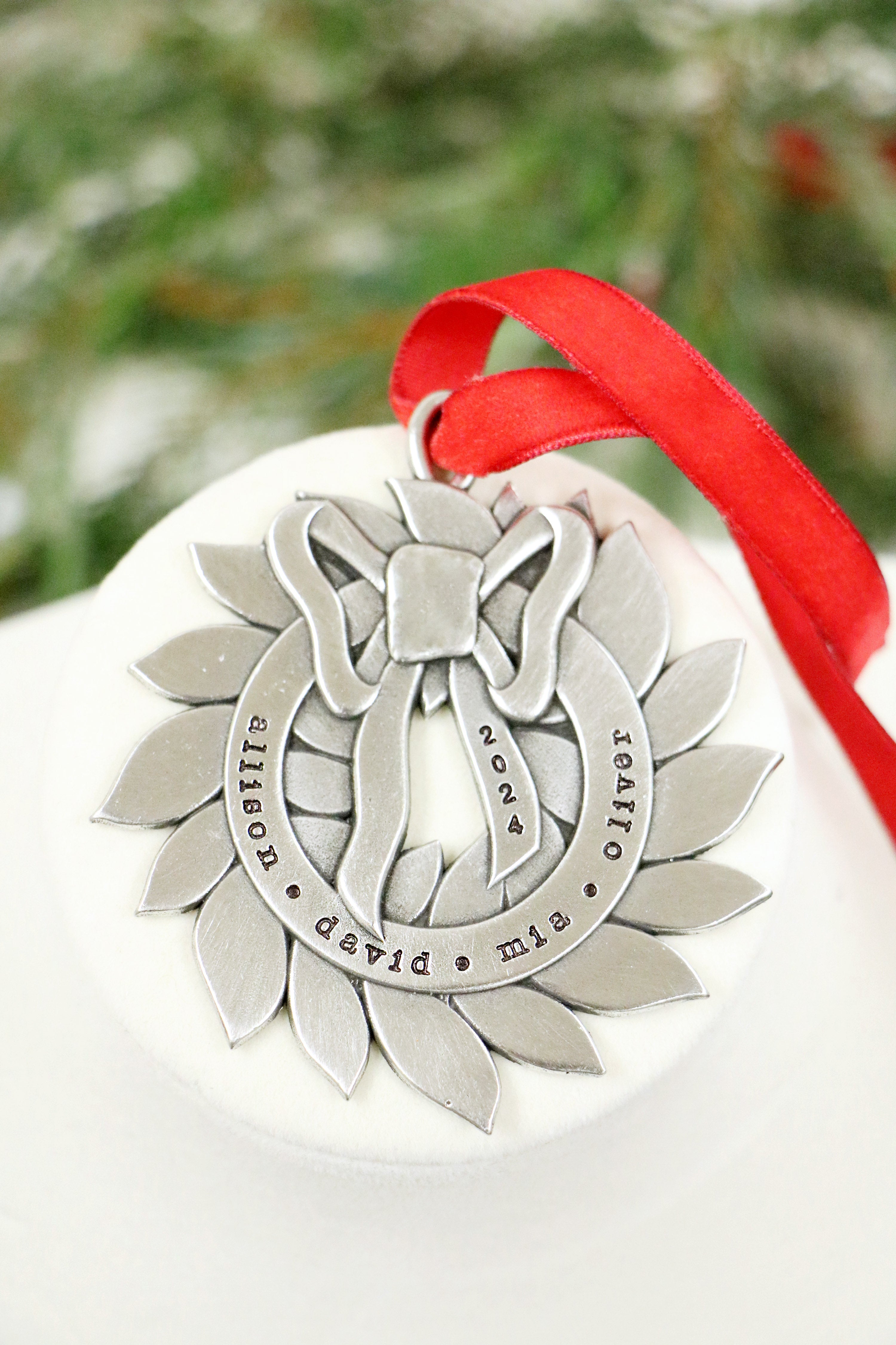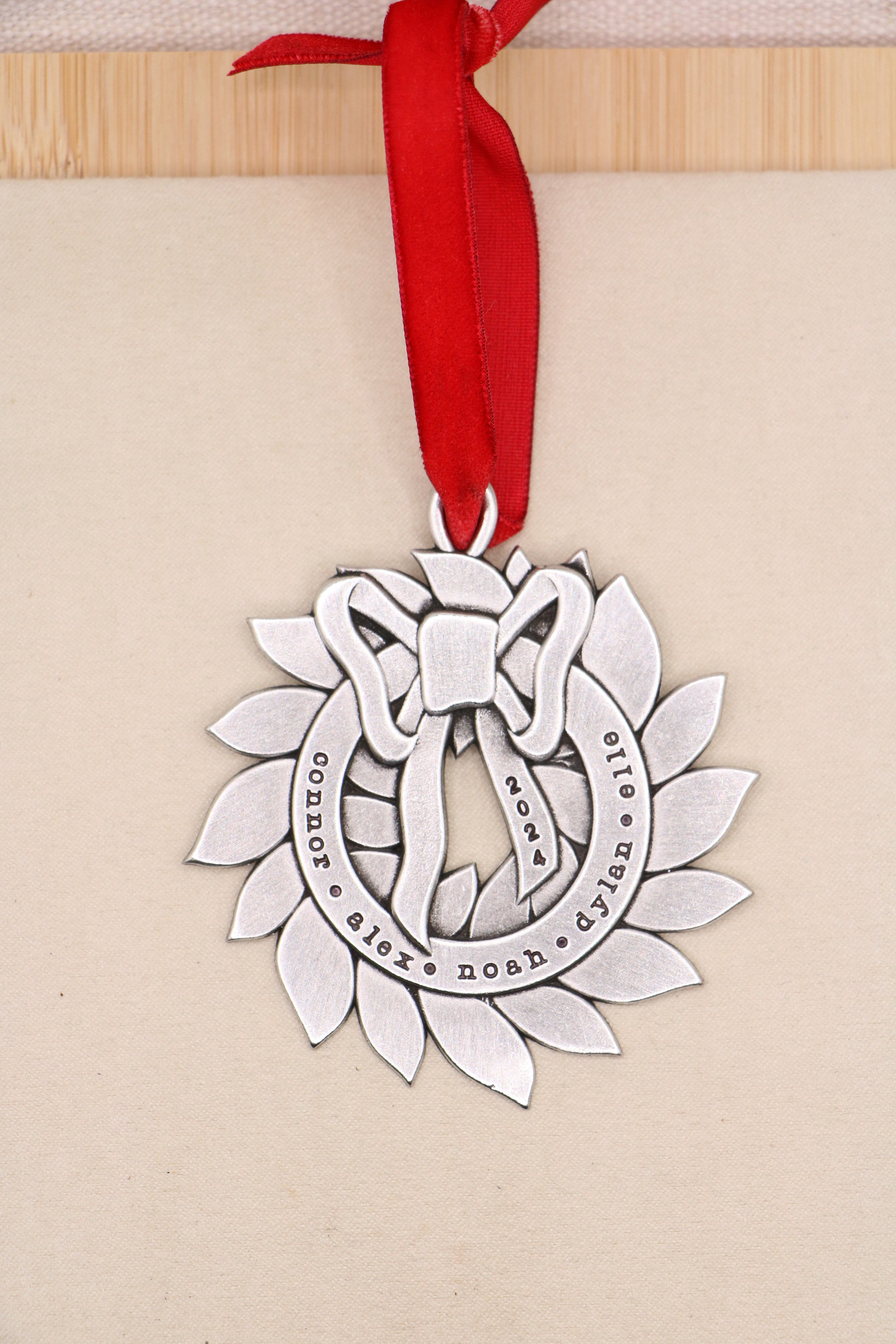 A wreath ornament adorned with a flowing bow makes the perfect holiday ornament. Personalize this ornament with names around the circle and the year vertically down the bow. Hung with a red velvet ribbon.